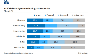 The German economy is focusing more on artificial intelligence (AI). At present, 27% of companies use AI. In the previous year, the figure was 13.3%. For around one in five companies, AI is not currently an issue. 17.5% plan to use AI in the coming months. „The trend is likely to pick up more speed,” says Klaus Wohlrabe, Head of Surveys at ifo Institute„Companies expect the use of AI to increase their productivity by more than 10%.”